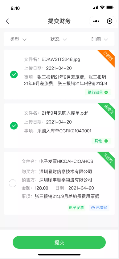3.一键提交财务不用再收集纸质和粘贴,支持向多个公司提交票据。