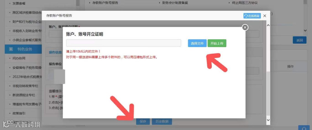 填写完信息之后,点击【账户、账号开立证明】下的方框,在弹出对话框中点击【选择文件】,选择必须报送的附件,点击【开始上传】。
