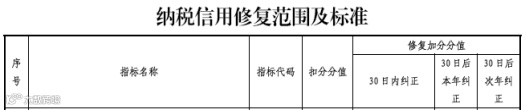国家税务总局公告2021年第31号规定:纳税信用修复范围及标准,加分分值根据补办时间与失信行为被税务机关列入失信记录的时间间隔确定,在30日内、本年内、次年内纠正的。