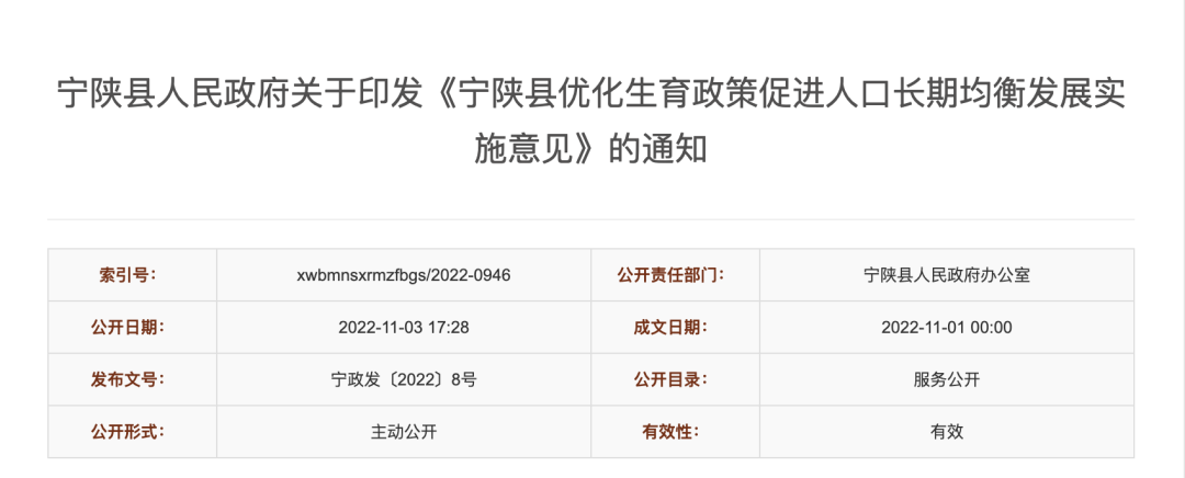 2022年11月1日,陕西省安康市宁陕县人民政府印发《宁陕县优化生育政策促进人口长期均衡发展实施意见》(下称《意见》),提出优化生育、养育、教育政策。意见于2023年1月1日正式执行。