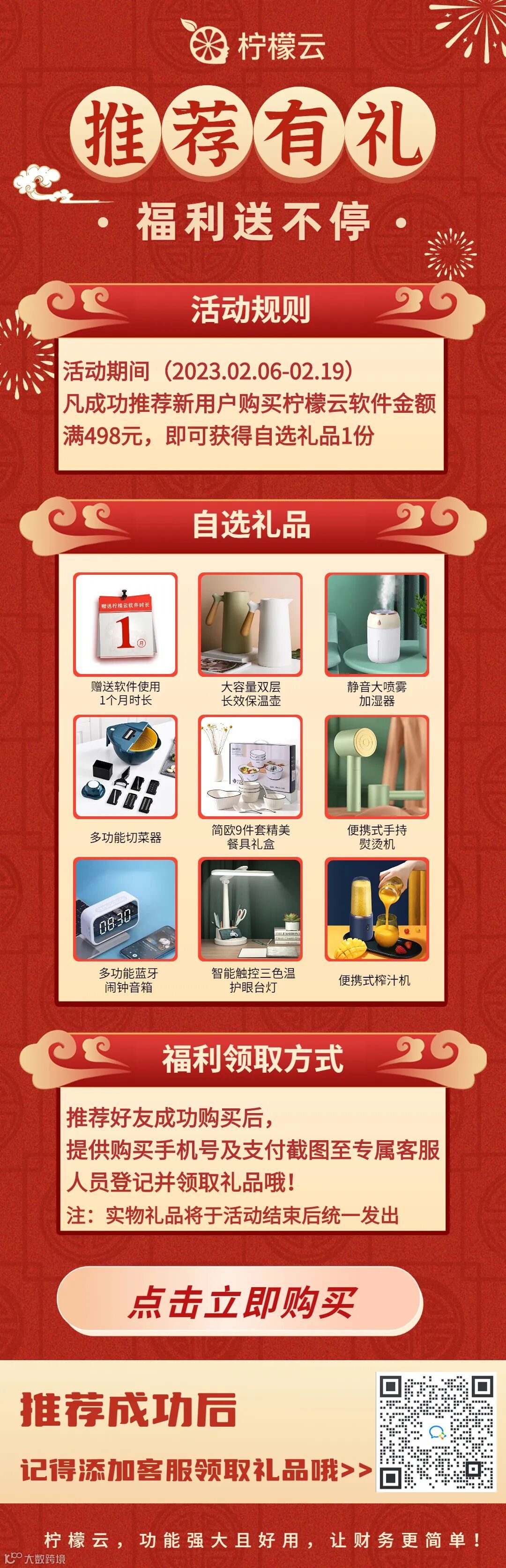 活动期间(2023.02.06-2023.02.19 )凡购买/续费柠檬云软件满498元,即可获得自选礼品1份。