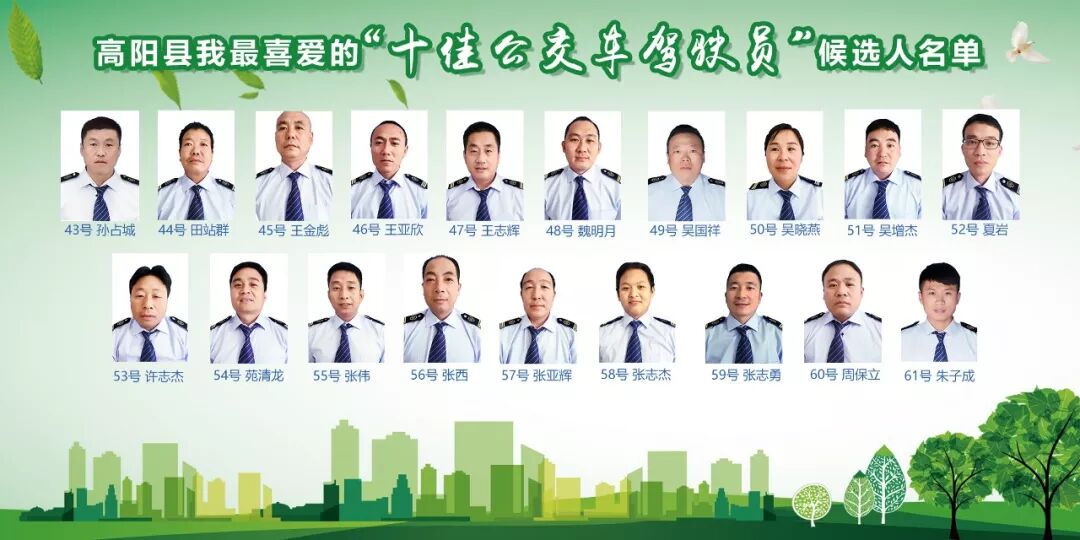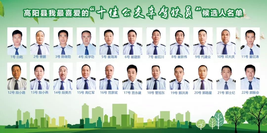 每天晨曦初现,他们已在路上;万家灯灭,他们仍在路上;逢年过节,舍弃小家,团圆万家;不管是风雨交加、天寒地冻还是烈日炎炎,他们天天与你同行。他们就是为千千万万人的出行方便辛勤奉献的公交司机。10月10日起截止到10月20日,高阳县公共交通有限公司联合高阳陈氏口腔医院举行“我最喜爱的高阳县十佳公交车驾驶员”评选活动,保定视界微信平台技术支持。哪位公交驾驶员的服务让你最满意?请投票推荐。