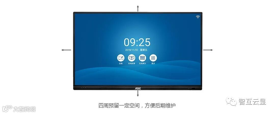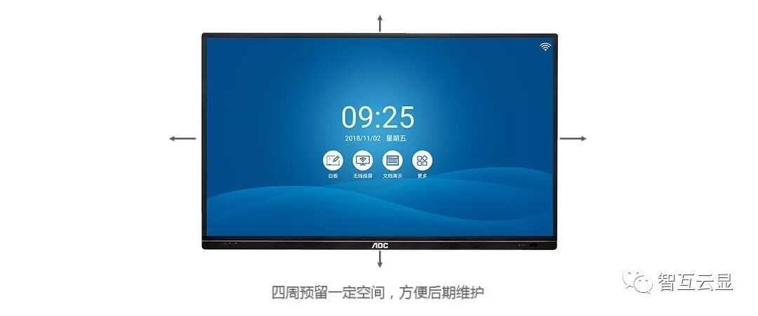 3)壁挂支架可左右移动,为了方便后期维护,建议在会议平板上下左右四周预留出不小于5cm的空间。