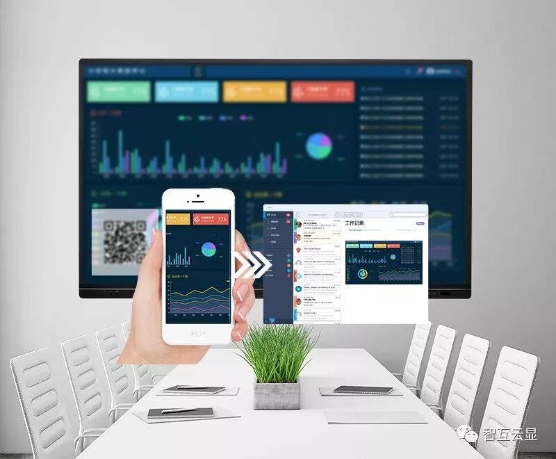 支持电脑、PAD、手机等设备通过无线投屏器或软件投屏方式将画面传到会议平板,一点即传,快速响应;搭载双wifi模块,支持上网、传屏同时进行反向控制,触摸会议平板也能控制电脑、手机、平板电脑,台上台下同时互动,提升会议效率,最大支持四画面分屏展示,在方案对比时更加直观。