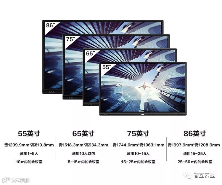 会议平板目前有55/65/75/86 四种尺寸规格,在进行方案设计时,需要根据实际场景的大小 来选择。