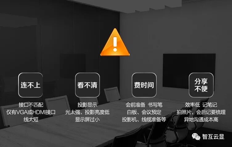 采用传统的投影机+电视机方案,会前需准备书写笔、板擦、笔记本电脑、投影仪+电视机接口是否匹配等琐碎事宜,影响会议的效率!