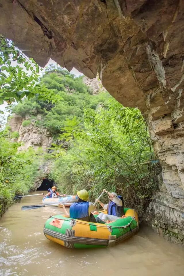 “华北第一洞漂”是华北地区唯一的山洞漂流,在长达5华里的隧道内,即使是干涸的季节也能看到哗哗的流水,乘皮划艇可从中漂流而进,漂流而出,经过七个高矮、宽窄、长短不同的山洞,高的有丈许,矮的洞顶擦着头顶而过,有些地方还需要我们半躺在游艇上才能通行;游人在幽深的洞中漂过,时而山穷水尽,时而柳暗花明,明暗交替、亦真亦幻、穿梭于此好似历经了七天七夜;再配上隧洞内现代化的声光电效果,让您体验一种真实的探奇之旅。