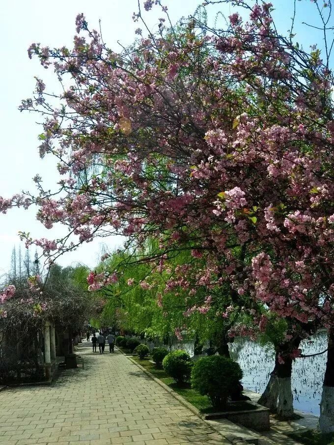 在这个三叉路口,车辆总是很多,公交车开的很慢也很稳。那个被奶奶或姥姥牵着手的小女孩儿此刻也安静的依偎在老人腿边,搅着两个小手,眼睛一眨一眨的打量着车上的人们。乘客们千姿百态,有的低头翻看着手机,有的打着电话却眉头紧锁。城市里的人们似乎都在忙碌,每个人也都是行色匆匆。此刻难得有这样的悠闲,我不由的望向窗外。车已经过了新县医院,驶上向阳路。路顿时显得开阔起来,笔直的马路车道分明,干干净净;路中间的绿植碧绿整齐,像一条细长碧绿的绒毯。“绒毯”上粉红色的花树开的正艳,团团簇簇,那柔柔的胭脂粉让人顿生爱慕;路边的杨柳新叶嫩绿,细长的枝条在微风的吹拂下,舞姿婀娜;像一位娇羞的少女在轻歌漫舞..........