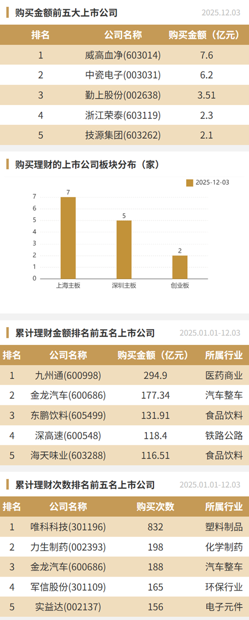 2025年12月3日,上市公司购买理财金额29.32亿元,共14家上市公司,理财产品46个。