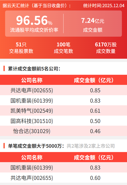 2025年12月4日,大宗交易成交金额7.24亿元,交易股票数51只,成交笔数100笔,流通股平均成交折价率96.56%,成交数量0.62亿股。