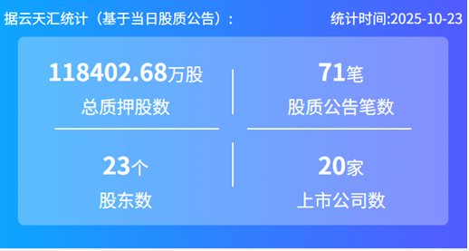 2025年10月23日,股票质押总质押股数11.84亿股,上市公司数20家,股质公告笔数71笔,股东数23个。