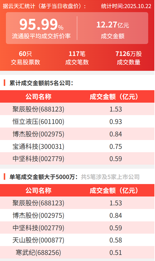 2025年10月22日,大宗交易成交金额12.27亿元,交易股票数60只,成交笔数117笔,流通股平均成交折价率95.99%,成交数量0.71亿股。