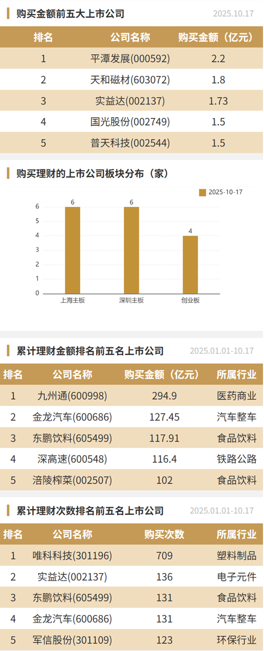 2025年10月17日,上市公司购买理财金额15.33亿元,共16家上市公司,理财产品66个。