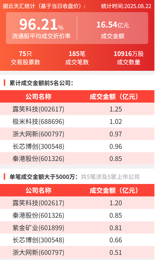 2025年8月22日,大宗交易成交金额16.54亿元,交易股票数75只,成交笔数185笔,流通股平均成交折价率96.21%,成交数量1.09亿股。