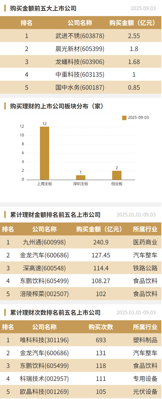 2025年9月3日,上市公司购买理财金额12.08亿元,共15家上市公司,理财产品29个。