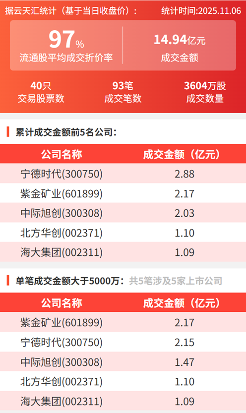 2025年11月6日,大宗交易成交金额14.94亿元,交易股票数40只,成交笔数93笔,流通股平均成交折价率97%,成交数量0.36亿股。