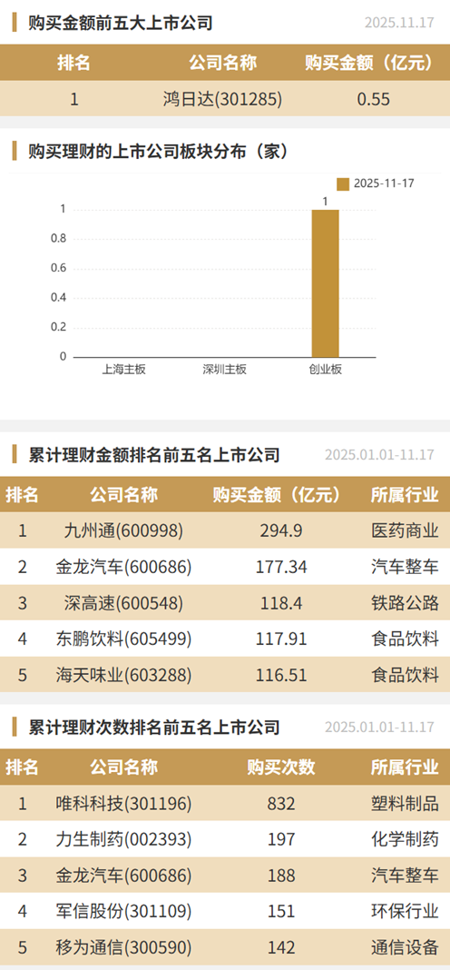 2025年11月17日,上市公司购买理财金额0.55亿元,共1家上市公司,理财产品2个。