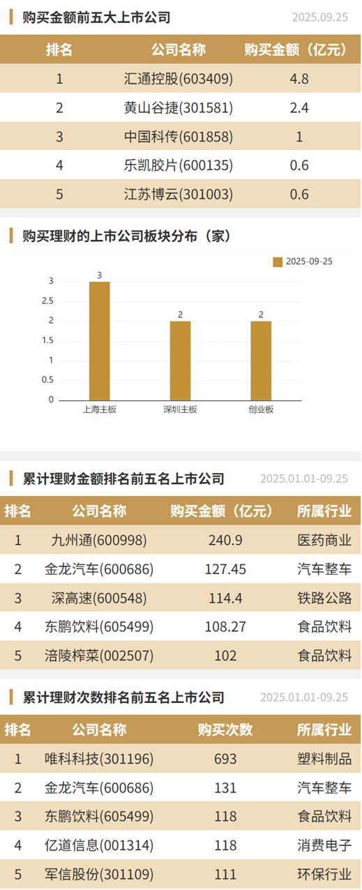 2025年9月25日,上市公司购买理财金额9.71亿元,共7家上市公司,理财产品17个。