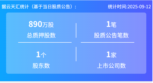 2025年9月12日,股票质押总质押股数890万股,上市公司数1家,股质公告笔数1笔,股东数1个。