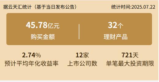 2025年7月22日,上市公司购买理财金额45.78亿元,共12家上市公司,理财产品32个。