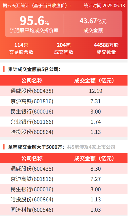 2025年6月13日,大宗交易成交金额43.67亿元,交易股票数114只,成交笔数204笔,流通股平均成交折价率95.6%,成交数量4.56亿股。