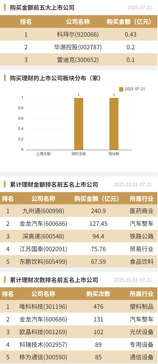 2025年7月21日,上市公司购买理财金额0.73亿元,共3家上市公司,理财产品3个。