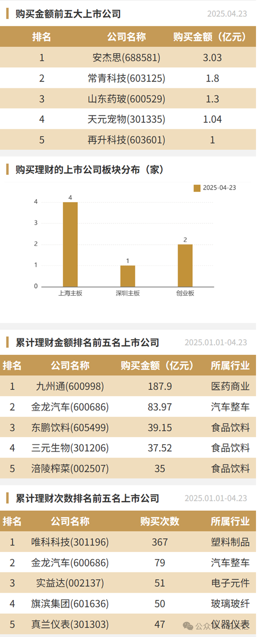 2025年4月23日,上市公司购买理财金额9.88亿元,共8家上市公司,理财产品25个。
