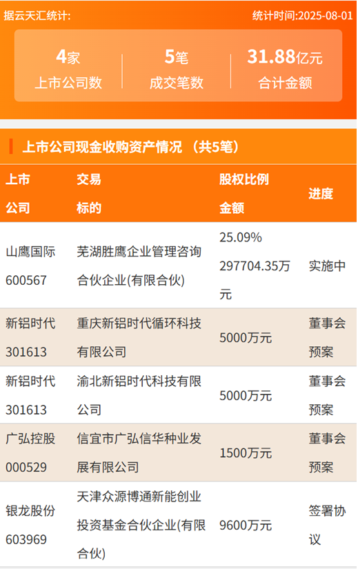2025年8月1日,资产交易成交金额31.88亿元,上市公司4家,成交5笔,上市公司现金收购资产5笔。