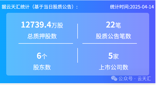 2025年4月14股票质押总质押股数1.27亿股,上市公司数5家,股质公告笔数22笔,股东数6个。
