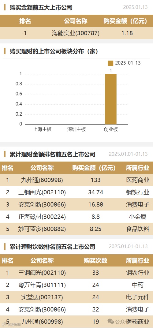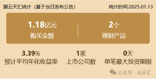 2025年1月13日,上市公司购买理财金额1.18亿元,共1家上市公司,理财产品2个。