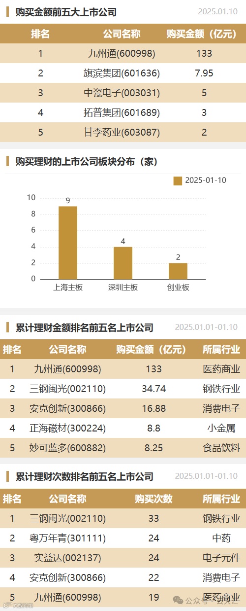 2025年1月10日,上市公司购买理财金额156.29亿元,共15家上市公司,理财产品46个。