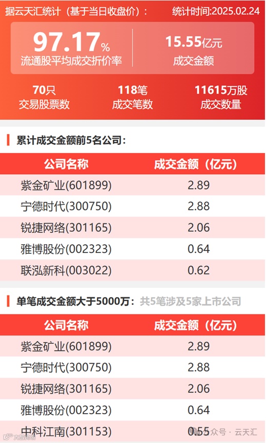 2025年2月24日,大宗交易成交金额15.55亿元,交易股票数70只,成交笔数118笔,流通股平均成交折价率97.17%,成交数量1.16亿股。