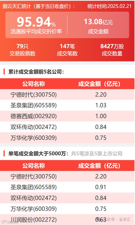 2025年2月21日,大宗交易成交金额13.08亿元,交易股票数79只,成交笔数147笔,流通股平均成交折价率95.94%,成交数量0.84亿股。
