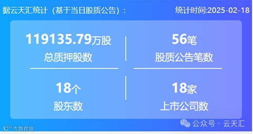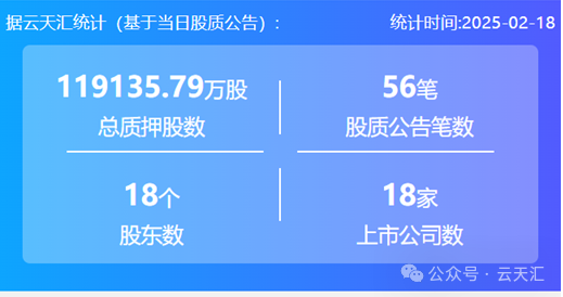 2025年2月18日,股票质押总质押股数11.91亿股,上市公司数18家,股质公告笔数56笔,股东数18个。
