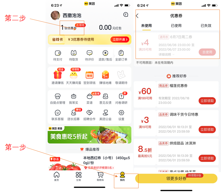 中奖的团长只需点开自己的美团优选账号,点击优惠券直接使用即可,具体操作方法如下: