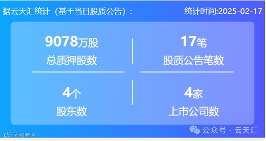 2025年2月17日,股票质押总质押股数0.9亿股,上市公司数4家,股质公告笔数17笔,股东数4个。