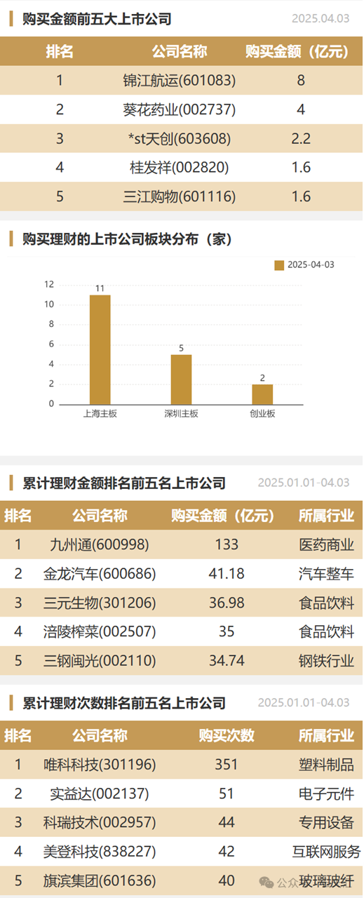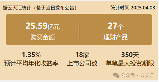 2025年4月3日,上市公司购买理财金额25.59亿元,共18家上市公司,理财产品27个。