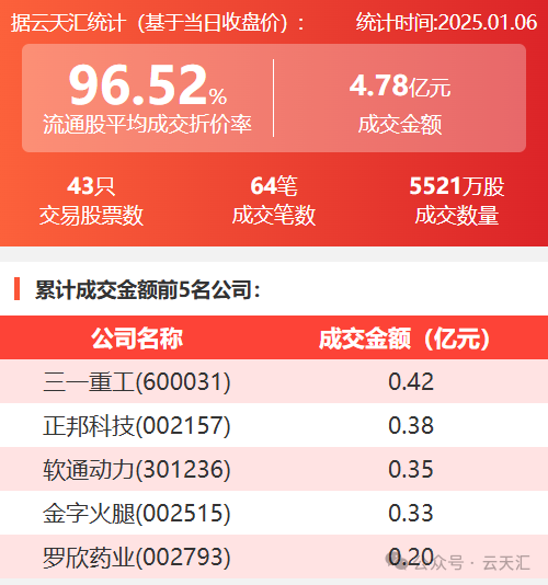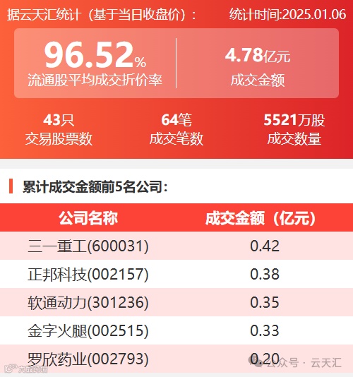 2025年1月6日,大宗交易成交金额4.78亿元,交易股票数43只,成交笔数64笔,流通股平均成交折价率96.52%,成交数量0.55亿股。