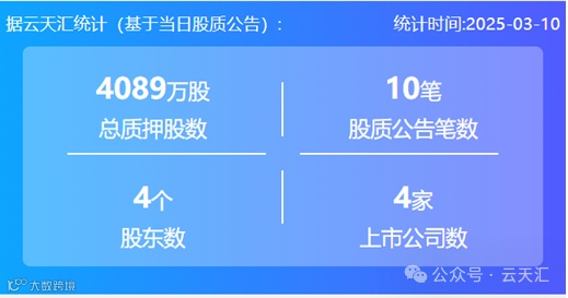 2025年3月10日,股票质押总质押股数0.4亿股,上市公司4家,股质公告笔数10笔,股东数4个。