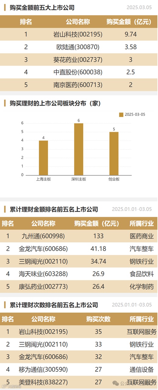 2025年3月5日,上市公司购买理财金额25.92亿元,共16家上市公司,理财产品77个。