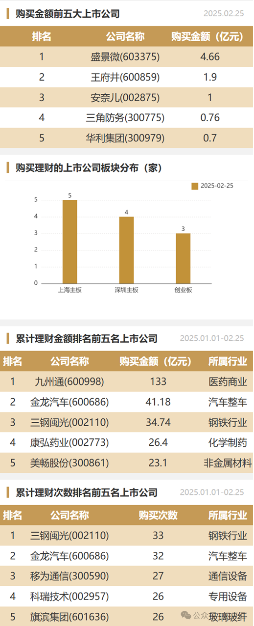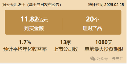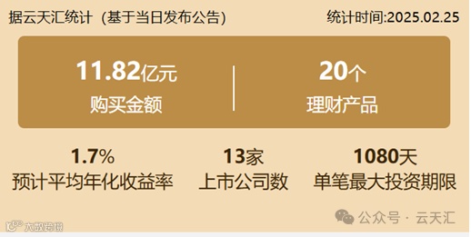 2025年2月25日,上市公司购买理财金额11.82亿元,共13家上市公司,理财产品20个。