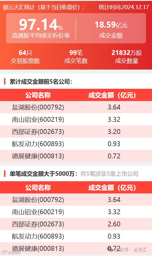2024年12月17日,大宗交易成交金额18.59亿元,交易股票数64只,成交笔数99笔,流通股平均成交折价率97.14%,成交数量2.18亿股。