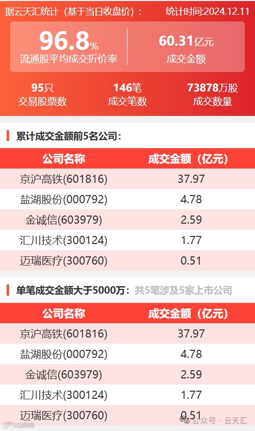2024年12月11日,大宗交易成交金额60.31亿元,交易股票数95只,成交笔数146笔,流通股平均成交折价率96.8%,成交数量7.39亿股。