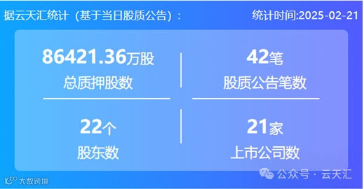 2025年2月21日,股票质押总质押股数8.64亿股,上市公司数21家,股质公告笔数42笔,股东数22个。