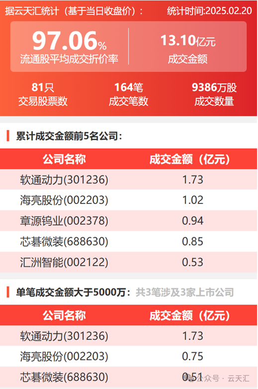 2025年2月20日,大宗交易成交金额13.10亿元,交易股票数81只,成交笔数164笔,流通股平均成交折价率97.06%,成交数量0.94亿股。