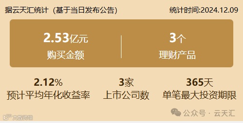 2024年12月9日,上市公司购买理财金额2.53亿元,共3家上市公司,理财产品3个。