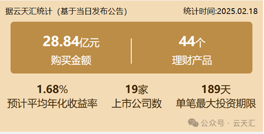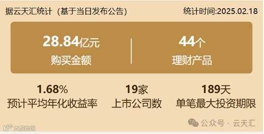 2025年2月18日,上市公司购买理财金额28.84亿元,共19家上市公司,理财产品44个。
