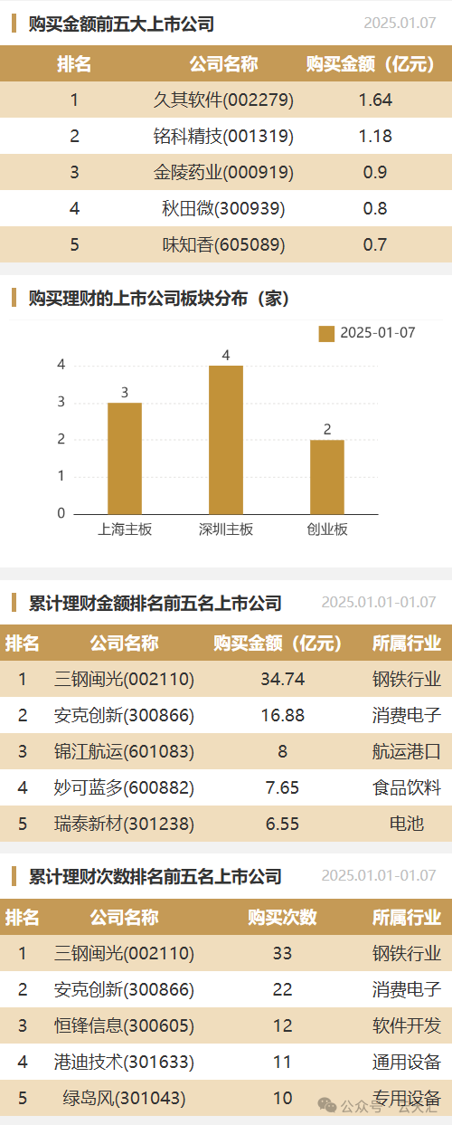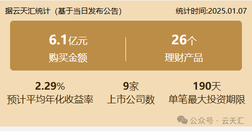 2025年1月7日,上市公司购买理财金额6.1亿元,共9家上市公司,理财产品26个。