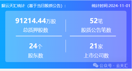 2024年11月1日,股票质押总质押股数9.12亿股,上市公司数21家,股质公告笔数52笔,股东数24个。