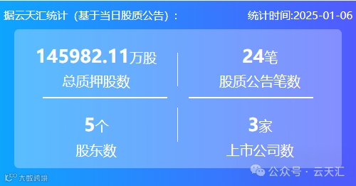 2025年1月6日,股票质押总质押股数14.59亿股,上市公司数3家,股质公告笔数24笔,股东数5个。